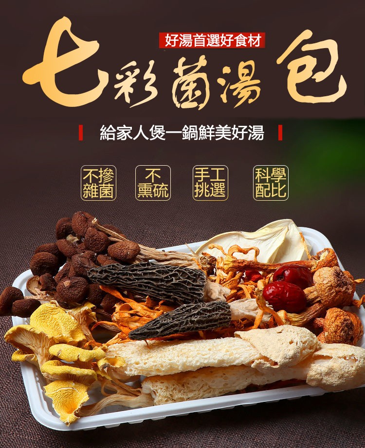 15分鐘前七彩菌湯包,鮮香濃郁,菌體肥嫩,當季乾貨,自然曬乾無硫熏,煲湯首選! - 自然無硫熏,無添加食用更安心! [秋冬 季節必備的七彩野生菌湯包x10=NT$1150 ]